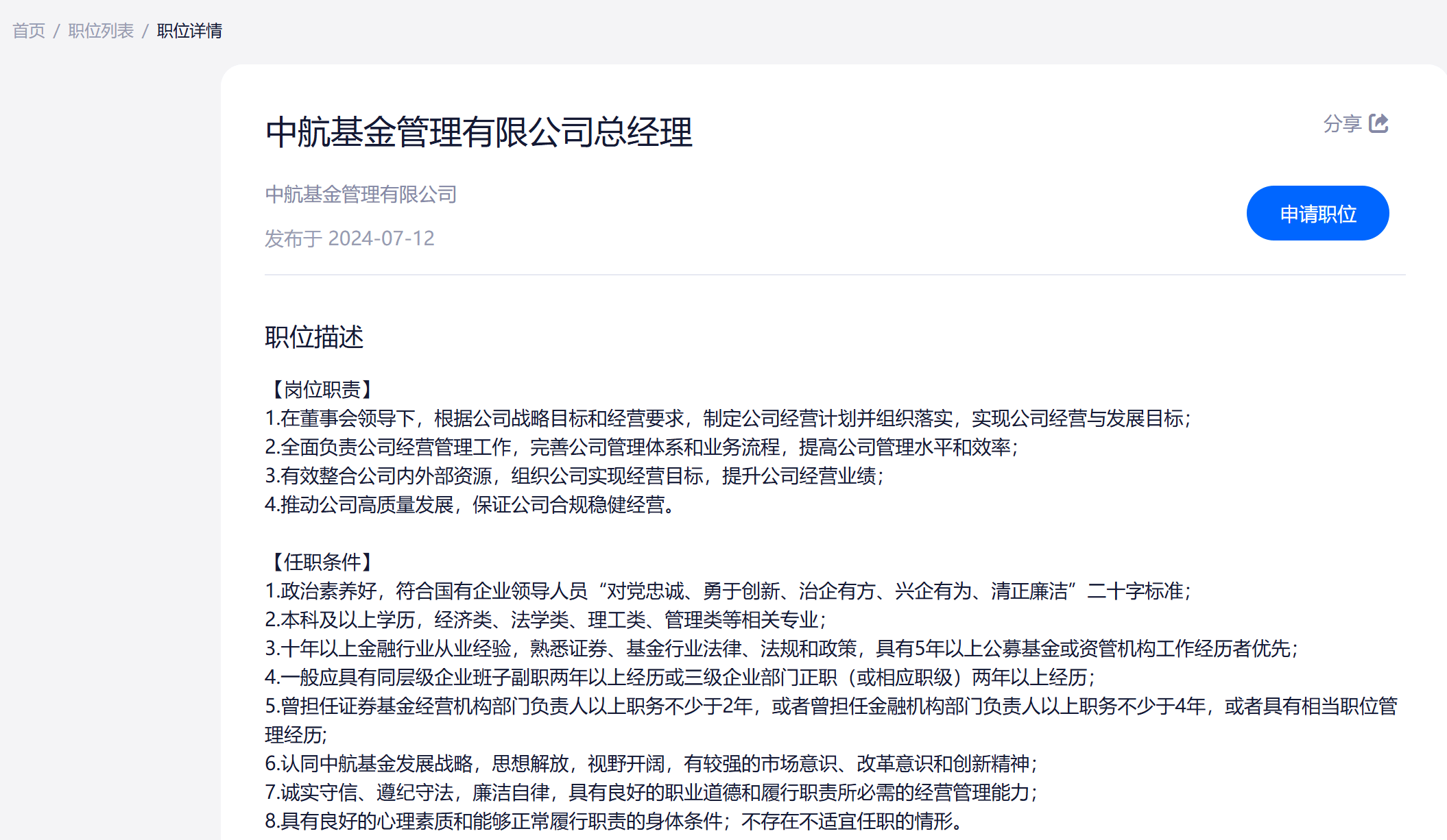 近日,中航证券官网发布了一则子公司中航基金的总经理招聘公告,职位描述中就详细阐述了岗位职责和任职条件。