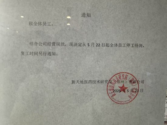 2025年5月下旬,新天地医药技术研究院(郑州)有限公司(以下简称“郑州新天地”)的一则停工待岗通知,引发员工集体维权。