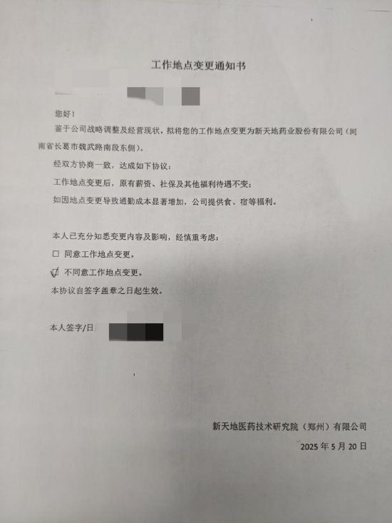 据员工反馈,停工待岗前两日(5月20日),公司曾下发《工作地点变更通知书》,要求员工从郑州迁至位于长葛市的总公司——新天地药业股份有限公司(以下简称“新天地药业”)所在地。通知书称“薪资、社保待遇不变”,并承诺提供食宿以弥补通勤成本。然而,郑州与长葛相距约100公里,跨市搬迁对多数员工而言意味着生活剧变。“要么接受调动,要么自主择业,但不给任何补偿。”一名员工愤慨道。