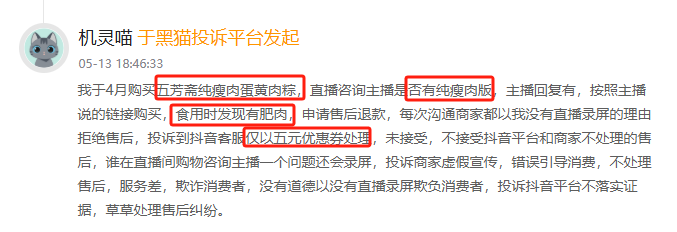 在本月中,有多名网友在黑猫平台上反馈称,在抖音直播间咨询五芳斋主播后,按其指引购买纯瘦肉蛋黄肉粽,食用时却发现含肥肉。申请售后退款遭商家以无直播录屏为由拒绝,抖音客服仅提供五元优惠券处理,消费者未接受。消费者认为商家虚假宣传、不处理售后、欺诈消费者。在本月中,五芳斋累计投诉29件,回复率为0%。