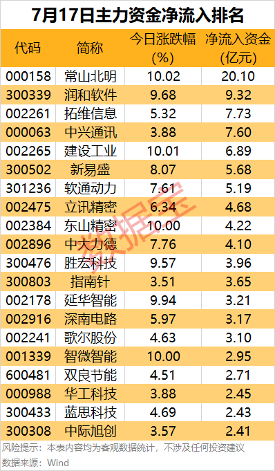 此外,还有拓维信息(002261)、中兴通讯(000063)、建设工业、新易盛(300502)等热门股主力资金净流入居前,均超5亿元。