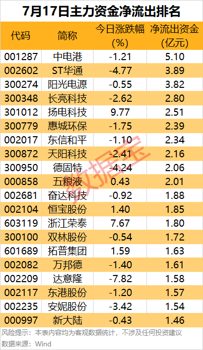 此外,还有ST华通、阳光电源(300274)、长亮科技(300348)、扬电科技、惠城环保(300779)等主力资金净流出金额居前。其中,扬电科技上涨9.77%。