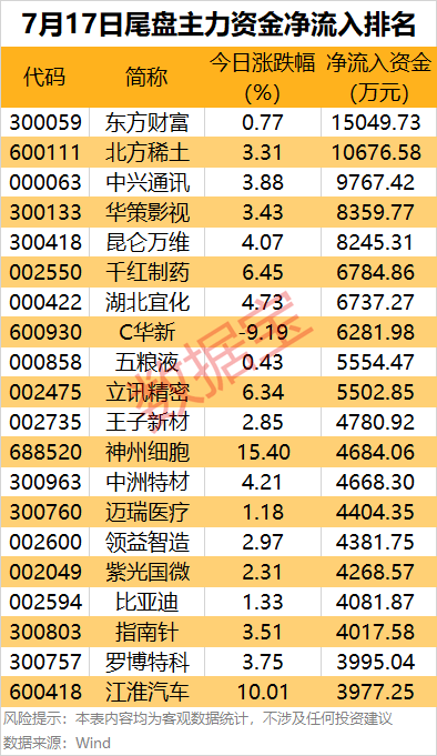 此外,还有中兴通讯、华策影视(300133)、昆仑万维(300418)、千红制药(002550)等尾盘主力资金净流入金额居前,均超6000万元。