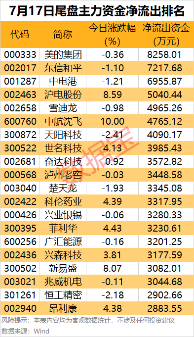 美的集团尾盘净流出金额居首,达8258.01万元。此外,还有东信和平(002017)、中电港、沪电股份(002463)、雪迪龙(002658)、中航沈飞(600760)、天阳科技等尾盘主力资金净流出金额居前。