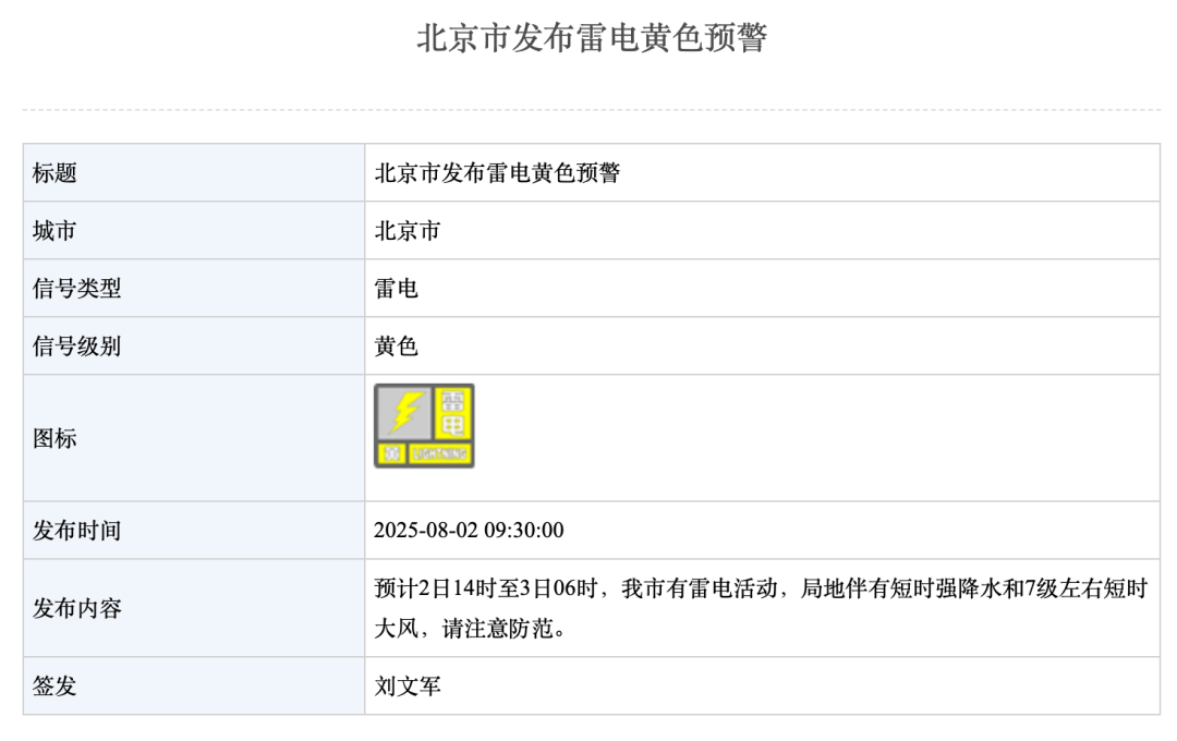 8月2日9时30分,北京市发布雷电黄色预警:预计8月2日14时至3日06时,北京有雷电活动,局地伴有短时强降水和7级左右短时大风,请注意防范。