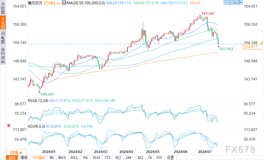 汇通财经APP讯――周三(7月24日)美盘时段,美元/日元盘中报154.022/033,跌幅0.99%。