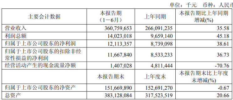 根据业绩预告,公司当时预计上半年实现归母净利润119.58亿~121.58亿元,同比增长36.84%~39.12%;预计第二季度实现归母净利润67.27亿~69.27亿元,同比增长47.72%~52.11%。
