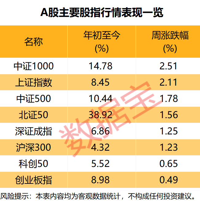 本周(8月4日至8日),A股市场震荡走高,成交额连续5个交易日在1.5万亿元以上。A股指数方面,周内沪指最高冲至3645.37点,最新报3635.13点,周涨幅2.11%;深证成指周涨幅1.25%,创业板指周涨幅0.49%。