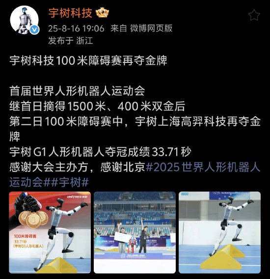 宇树科技捷报频传,继首日赢得1500米和400米双金后,在第二日举行的100米障碍赛中,宇树上海高羿科技G1人形机器人以33.71秒的优异成绩再夺金牌。至此,宇树已在本届赛事中连夺三金,宇树科技表示,感谢大会主办方,感谢北京。