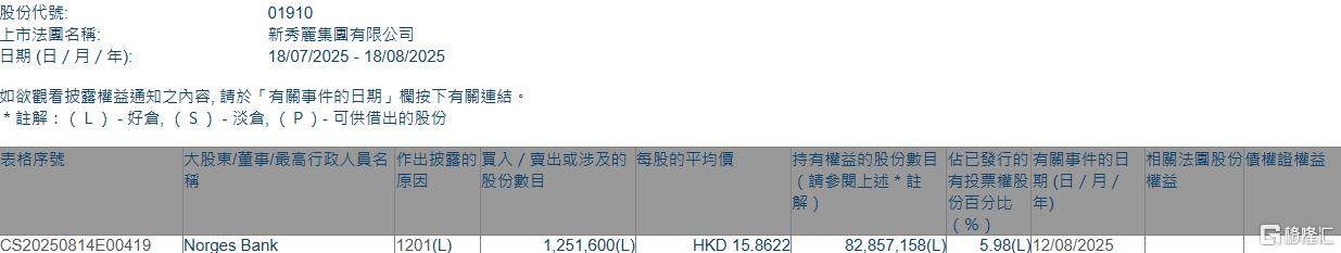 格隆汇8月18日丨根据联交所最新权益披露资料显示,2025年8月12日,新秀丽(01910.HK)遭Norges Bank在场内以每股均价15.8622港元减持125.16万股,涉资约1985.31万港元。