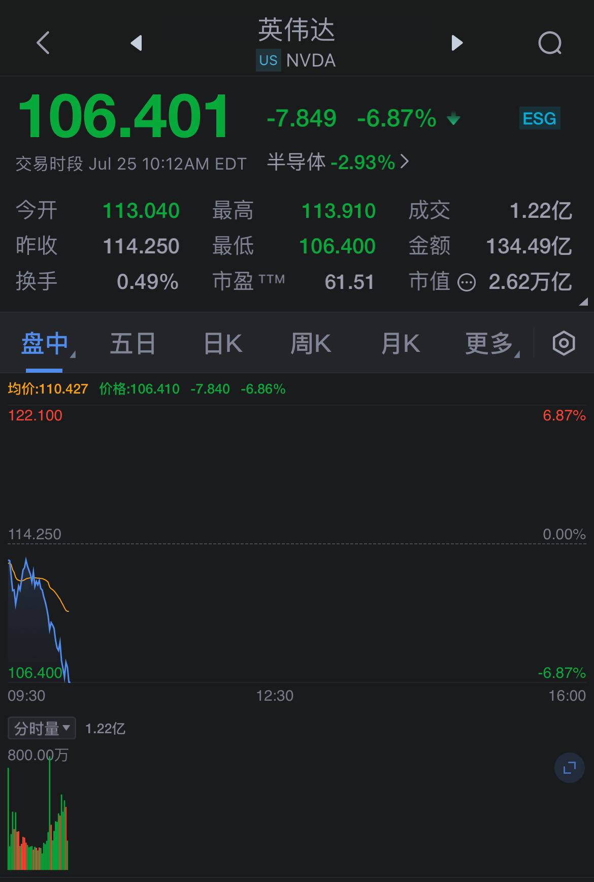 英伟达盘中一度下跌6.8%,跌至两个月来的最低点。