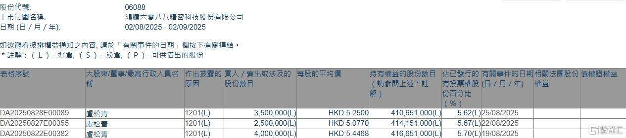 格隆汇9月2日丨根据联交所最新权益披露资料显示,2025年8月25日,FIT HON TENG(06088.HK)遭执行董事兼董事会主席卢松青在场内以每股均价5.25港元减持350万股,涉资约1837.5万港元。