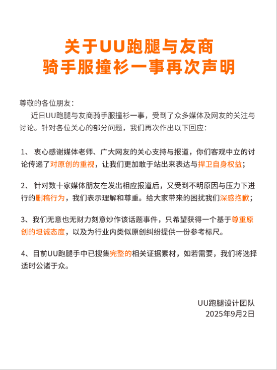 9月2日消息,UU跑腿与友商骑手服撞衫一事,受到了网友关注。UU跑腿设计团队今天发布《关于UU跑腿与友商骑手服撞衫一事再次声明》,声明表示,“无意也无财力刻意炒作该话题事件,只希望获得一个基于尊重原创的坦诚态度,以及为行业内类似原创纠纷提供一份参考标尺。”