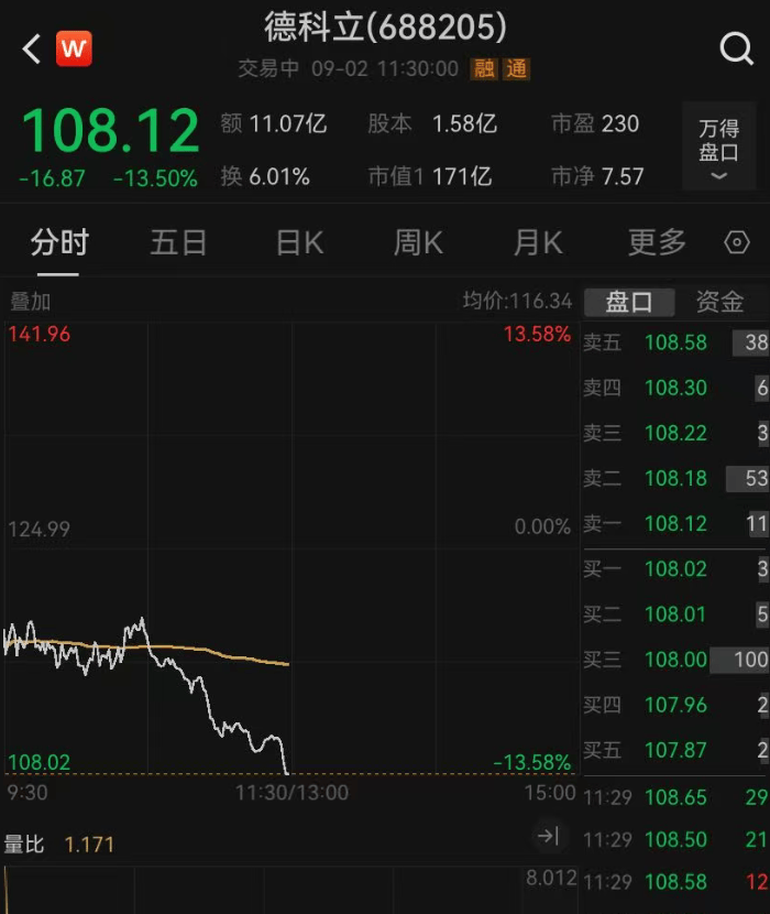 9月2日,德科立低开低走,截至午间休盘,跌13.5%,每股报108.12元,总市值171亿元。