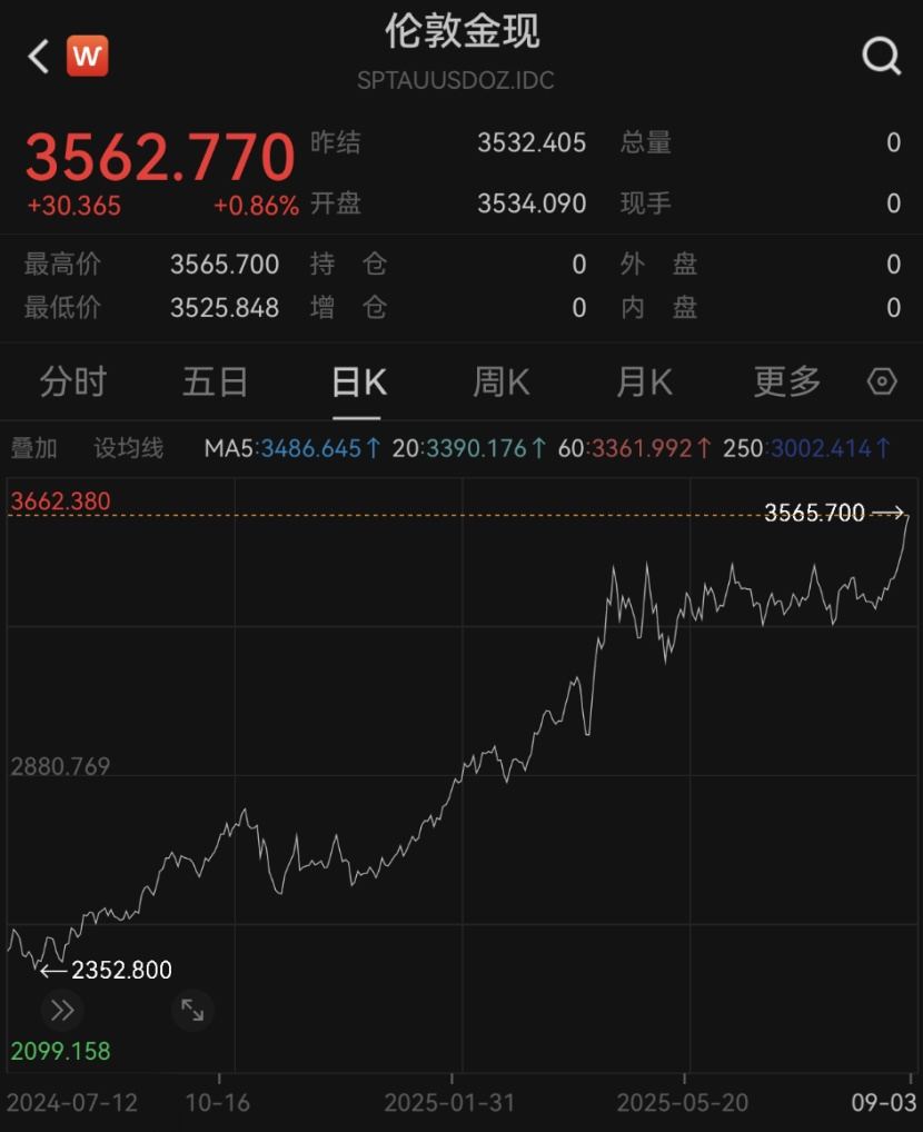 现货黄金价格直线飙升,首次站上3550美元/盎司,截至22:30,日内涨0.86%,报3562.77美元/盎司,今年迄今累计涨幅超35%。