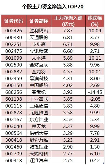 个股来看,今日有1783只个股获主力资金净流入,其中,57股获主力资金净流入超1亿元。胜利精密(002426)主力资金净流入最多,净流入金额为7.87亿元;主力资金净流入居前的个股还有天通股份(600330)、步步高(002251)、立讯精密(002475)、太平洋(601099)、金财互联(002530)等,净流入金额分别为6.81亿元、6.71亿元、6.6亿元、5.89亿元、5.88亿元。