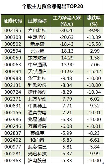 今日有3360只个股被主力资金净卖出,其中,200股被主力资金净卖出超1亿元。主力资金净流出最多的个股是岩山科技,净流出金额为30.26亿元;主力资金净流出居前的个股还有中际旭创(300308)、新易盛(300502)、比亚迪(002594)、东方财富(300059)、中兴通讯(000063)等,净流出金额分别为20.63亿元、18.43亿元、18.13亿元、14.29亿元、13.9亿元。