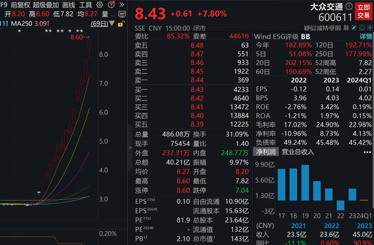 近期,受智能交通、网约车等热门概念加持,大众交通股价一飞冲天,15个交易日累计上涨203.24%,走出“独立行情”之势。据公开消息,公司具备出租、租赁、出行、汽车服务等相关业务板块。