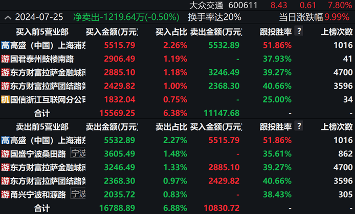 从盘后数据来看,近一个月,大众交通累计14次登上龙虎榜。最近一次是7月25日,上榜营业部席位全天成交3.24亿元,占当日总成交金额比例为13.27%。多家游资纷纷下场博弈,“散户大本营”的东方财富(300059)拉萨营业部上榜,知名游资宁波和源路为卖五席位。