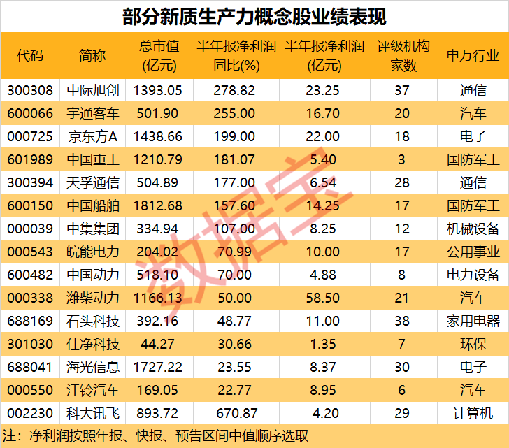 从业绩来看,已发布半年报相关报告的新质生产力相关个股同样表现良好。中际旭创、宇通客车净利润同比增幅超过200%;京东方A、中国重工(601989)、天孚通信(300394)、中国船舶(600150)、中集集团净利润同比翻倍。
