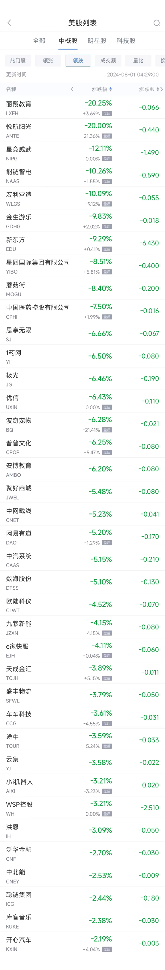 下跌股当中(按市值降序排列),百度跌0.19%,新东方跌9.29%,WSP控股跌3.21%,极氪跌0.12%。