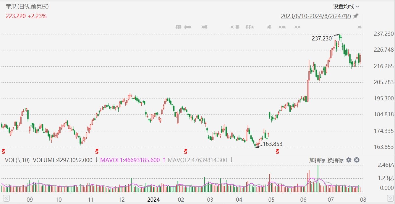 苹果(AAPL.US)盘中逆市上涨2.77%报224.41美元。苹果最新公布的财报显示,截至6月29日的第三财季,公司营收增长5%至858亿美元,高于市场预期的845亿美元;每股盈利1.40美元,高于市场预期的1.35美元。
