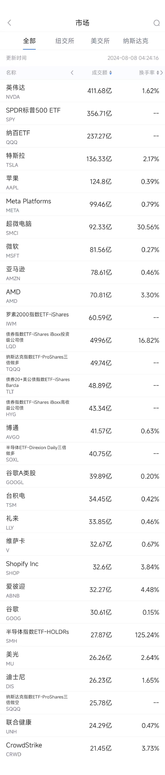 8月7日美股成交额前20:超微电脑业绩未达标,股价重挫逾20%