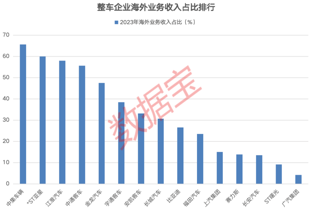 统计显示,A股上市的整车企业上市公司中,15家在2023年年报披露海外业务收入,其中中集车辆、*ST亚星、江淮汽车(600418)、中通客车(000957)海外业务收入占比在50%以上,乘用车中长城汽车(601633)、比亚迪(002594)、福田汽车(600166)海外业务收入占比超20%。