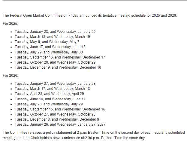 美联储周五公布了2025年、2026年和2027年1月的联邦公开市场委员会(FOMC)会议的暂定时间表。