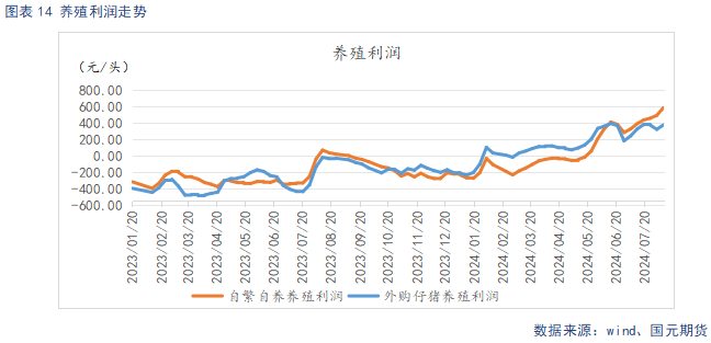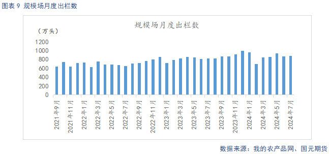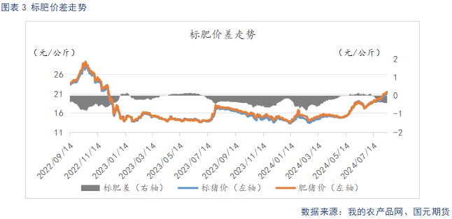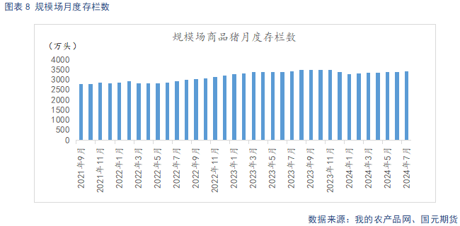 据Mysteel统计,截止2024年7月底,规模场能繁母猪存栏量为494.85万头,环比上涨1.14%,同比下降2.34%。近两月猪价重心上移明显,养殖端利润处于较好区间,主动调减产能的意愿不高,规模场能繁母猪存栏连续5个月环比小幅上升,从生产周期推算,三四季度供给环比缩减趋势不变,不过明年产能预期将出现恢复,远月合约承压弱势运行。规模场7月商品猪存栏数为3433.34万头,环比上升1.46%,同比增加0.16%。7月出栏量为879.93万头,环比减少1.62%,同比增加14.43%。端午后需求进入季节性淡季,价格高位回落,散户认价出栏增多,规模场放缓了出栏节奏。进入7月,在高温高湿气候下,疫病防控难度大,价格拉涨后,规模场顺价出栏,当月计划出栏量完成良好。8月,标肥价差持续走扩,市场预期向好,规模场月初出栏短期缩量。随着价格上行至21元/公斤附近,下游需求端支撑明显不足,加之达到出栏标准的猪源增多,部分规模场加快了出栏节奏,预计8月整体出栏规模延续小幅增加。