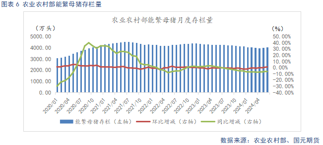 根据农业农村部数据显示,2024年6月末全国能繁母猪存栏量4038万头,同比下降6%,环比上涨1.1%。相当于正常保有量的103.5%,处于绿色区域。下半年产能去化效果逐步显现,对猪价下方形成较稳固的支撑。不过随着我国生猪行业生产效率提升以及猪肉消费需求等变化,3月1日农业农村部新修正的《生猪产能调控实施方案》发布,提出将能繁母猪正常保有量从4100万头下调至3900万头,以此来看,当前存栏基数的实际产能比预期偏大,猪价上行幅度不宜过高估计。