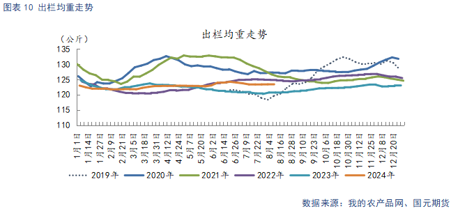截止8月9日,生猪出栏均重123.42公斤,与上月环比上调0.02公斤。标肥价差倒挂,大猪溢价较多,前期压栏、二育的大体重猪开始陆续出栏,出栏均重预期延续小幅上调。