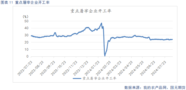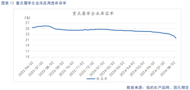 截止8月13日,重点屠宰企业开工率为23.6%,较上周环比上升0.26%。冷冻肉库容率21.46%,较上周环比下降0.89%。终端消费低迷,短期改善有限,开工率持续在低位窄幅波动,回升缓慢。猪价快速上行,鲜肉价格持续走高,冻肉涨幅相对较小,价差优势下,冻肉需求好转,库存降幅加速。