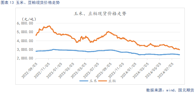 截止8月13日,玉米现货价格2402.65元/吨,较上周环比下跌14.49元/吨,豆粕现货价2972元/吨,较上周环比下跌90.86元/吨。玉米从基本面看,新季玉米存丰产预期,且今年小麦总体丰产,部叠加进口玉米预期增加,供给端呈宽松格局。下游需求则改善有限,玉米整体偏弱。豆粕从基本面看,USDA8月报告进一步验证美豆丰产预期,国内进口大豆到港高峰将过,而现货持续走低提振部分下游企业备货积极性,豆粕季节性累库周期预计随着到港量回落而收尾。豆粕内外供应宽松格局未变,仍将承压运行。