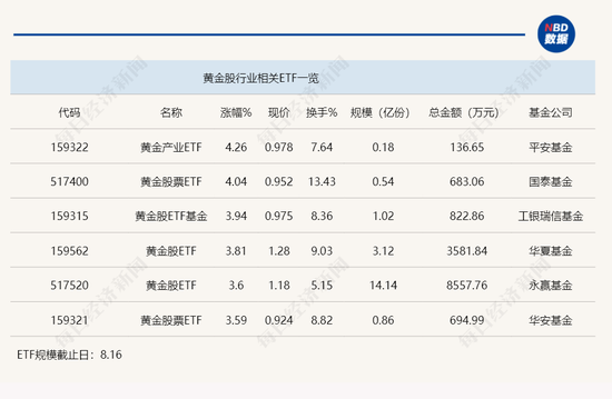 随着金价再创新高,今日黄金股全线大涨,黄金产业ETF(159322)和黄金股票ETF(517400)两只ETF半日涨幅超过4%,而其余多只黄金股相关ETF半日涨幅也均达到3.5%以上。