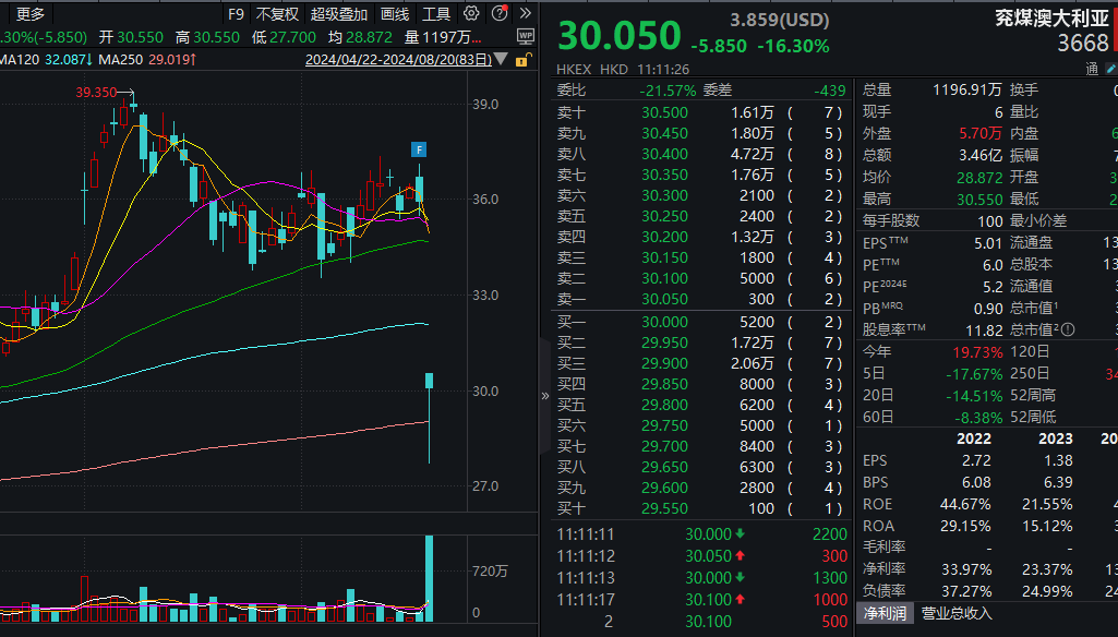 其他股价大幅波动的个股方面,兖煤澳大利亚股价暴跌,盘中跌幅一度超过22%。