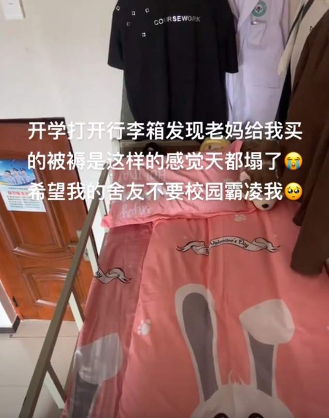 随着新学期的到来,一名来自云南昆明的大学男生在宿舍准备铺床时遭遇了一件令人哭笑不得的事情。当他打开行李箱,意外发现母亲为他准备的被褥全部是粉色,并印有小兔子图案,这让他感到既惊讶又尴尬。该男生在社交媒体上分享了这一情况,并戏称"感觉天塌了"。