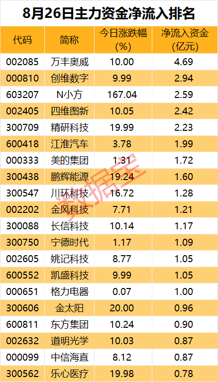 15只个股获主力净流入超亿元。万丰奥威(002085)今日收盘涨停,全天成交金额为20.17亿元,换手率为7.79%。万丰奥威主力资金净流入4.69亿元,居首。