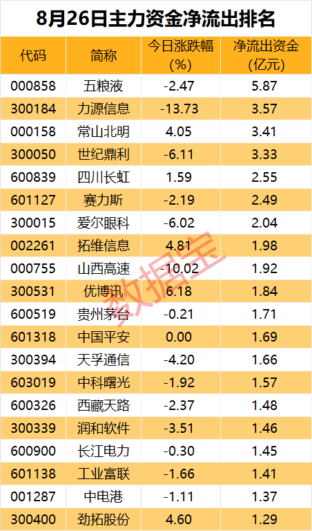主力资金净流出个股中,有29股主力资金净流出超1亿元。五粮液(000858)主力资金净流出5.87亿元,居首。该股连续7日主力资金净流出,累计净流出14.67亿元。
