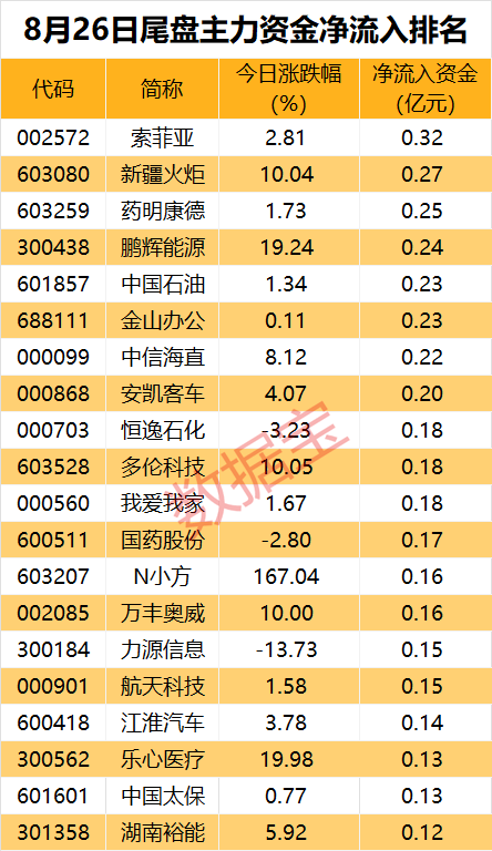 个股方面,索菲亚(002572)、新疆火炬(603080)、药明康德(603259)、鹏辉能源(300438)等26股尾盘主力资金净流入超千万元。