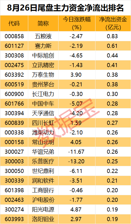 51股尾盘遭主力资金出逃超千万元。五粮液(000858)尾盘主力资金净流出最高,达8279.88万元。赛力斯尾盘主力资金净流出6067.65万元,居次席。中际旭创(300308)、立讯精密(002475)、万泰生物、贵州茅台(600519)等股尾盘主力资金净流出居前,均超3000万元。