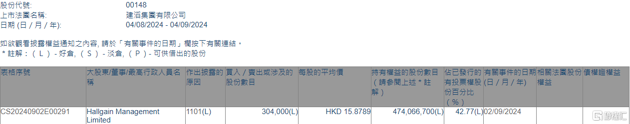 建滔集团(00148.HK)获Hallgain Management增持30.4万股