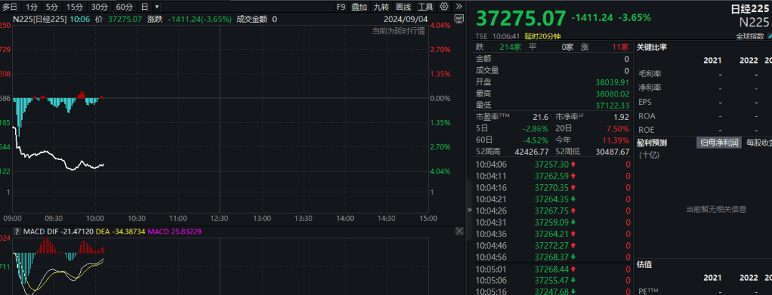 东证指数跌势也不小,开盘后不久跌幅即超过3%,创出今年8月6日以来近一个月最大盘中跌幅。
