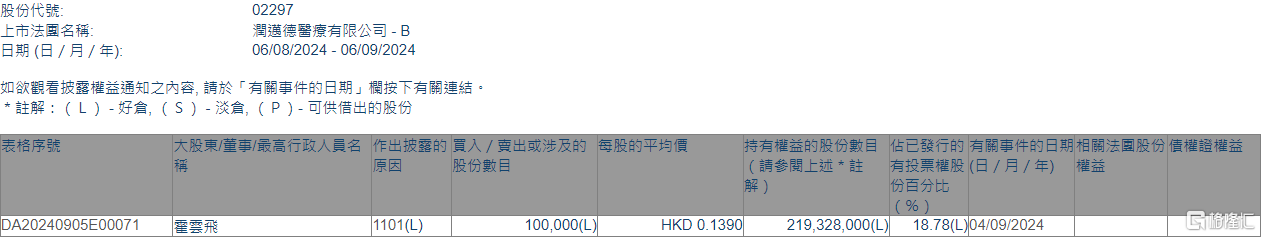 格隆汇9月6日丨根据联交所最新权益披露资料显示,2024年9月4日,润迈德-B(02297.HK)获执行董事霍云飞在场内以每股均价0.139港元增持10万股,涉资约1.39万港元。