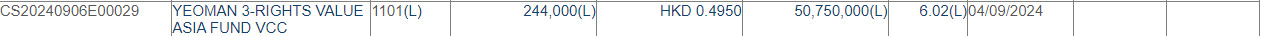增持后,YEOMAN 3-RIGHTS VALUE ASIA FUND VCC最新持股数目为5075万股,持股比例由5.99%上升至6.02%。