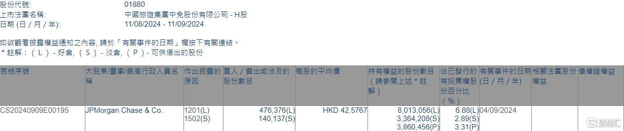 格隆汇9月11日丨根据联交所最新权益披露资料显示,2024年9月4日,中国中免(01880.HK)遭JPMorgan Chase & Co.以每股均价42.5767港元减持好仓47.64万股,涉资约2028.25万港元。