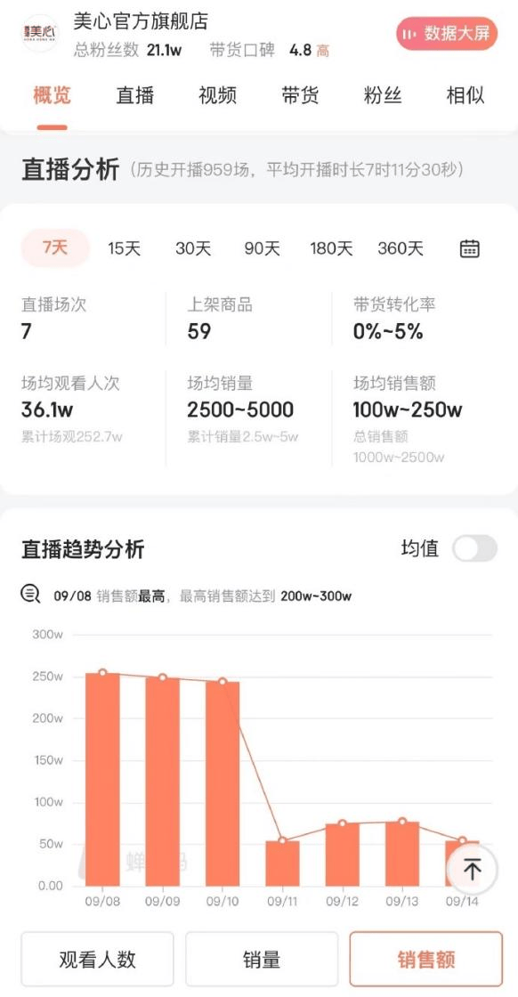 与此同时,美心月饼直播间也呈现热闹景象。第三方数据显示,某直播平台美心官方旗舰店近7天直播7次,场均观看人次36万,场均销售额100万元―250万元,总销售额1000万元―2500万元。