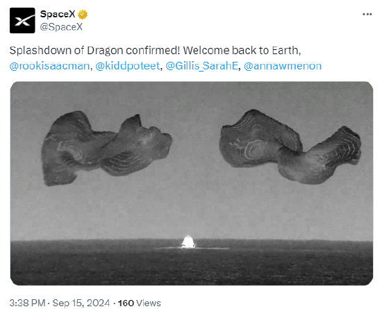 SpaceX龙飞船成功溅落 全球首次商业太空行走创造历史