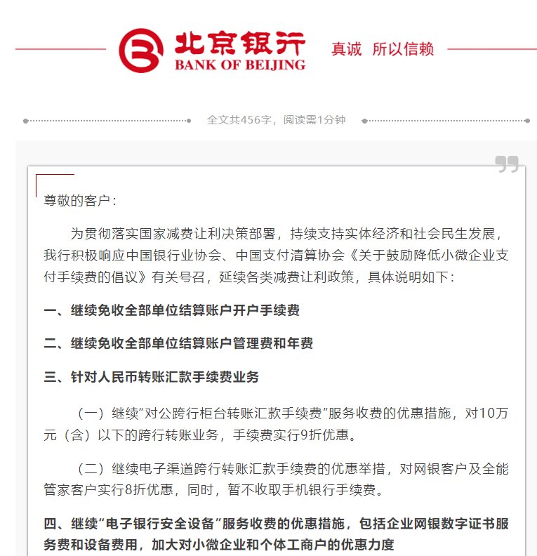 9月29日金融一线消息,北京银行发布关于继续做好减免支付相关服务项目收费的公告。公告显示,为贯彻落实国家减费让利决策部署,持续支持实体经济和社会民生发展,我行积极响应中国银行业协会、中国支付清算协会《关于鼓励降低小微企业支付手续费的倡议》有关号召,延续各类减费让利政策,具体说明如下: