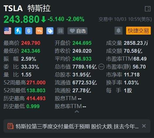 美股异动丨特斯拉续跌超2% Q3交付量增幅低于预期